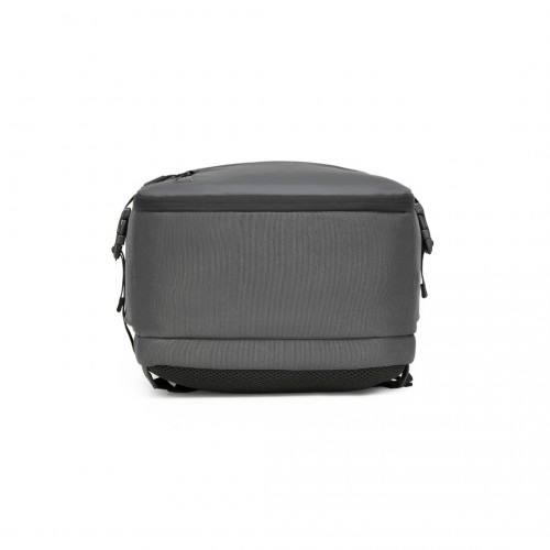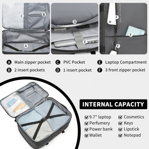 Features two main zippered sections.First Compartment: Designed like a suitcase, with slip pockets, key clip, and a waterproof section for toiletries. An elastic cross-strap secures clothing, ensuring a neat and compact storage.And the side pocket can hold a power bank to connect to the external port.