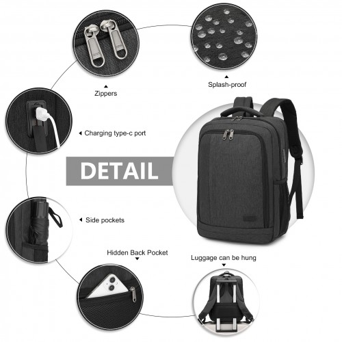 BPK2442 – Kono Commuter Laptop Backpack with USB & Type-C Port, Anti-Theft Pocket, Organised Storage – Black