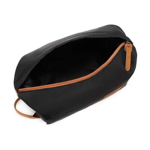 This versatile bag features an expandable design with a bottom zipper that increases its capacity. It offers a large main compartment, a separate wet/dry area, and dedicated pockets for small essentials. A back pocket provides quick access to personal items, while a nylon strap allows for easy attachment to luggage handles. A complementary clutch for toiletries adds to its travel-ready convenience, and a wide shoulder strap ensures comfortable carrying.