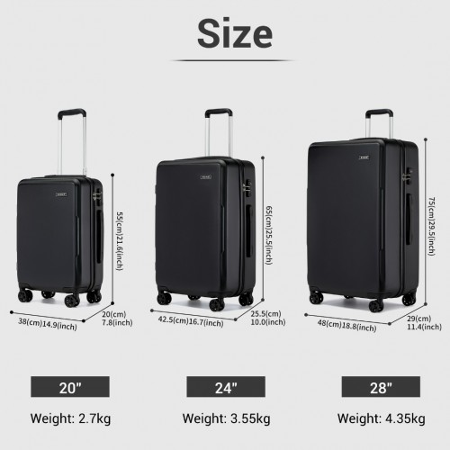 KSK2494 – Kono 3-Piece Minimalist Hard Shell ABS+PC Luggage Set with TSA Lock and 360° Spinner Wheels – Black