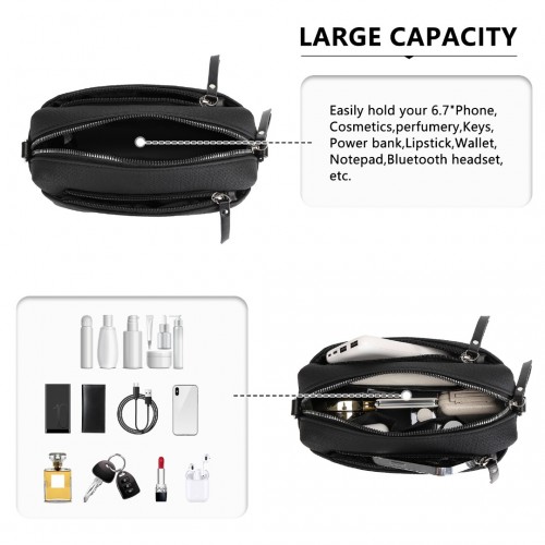 Ample space for your essentials – phone, purse, keys and cosmetics/toiletries fit easily and securely.