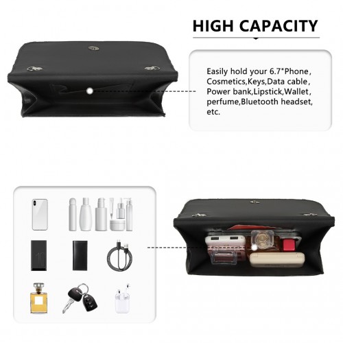 Ample space for your essentials:phone, purse, key and cosmetics/toiletries.