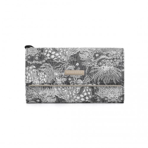 The wallet’s exterior is adorned with a sleek metallic bar on the flap, intricately laser-etched with the “MISS LULU” logo. This premium detail not only emphasizes the brand’s identity but also enhances the wallet’s refined aesthetic.